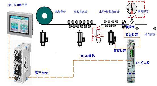 DKC**系列伺服驅(qū)動器提供了一種柔性、開放和通用的的系統(tǒng)解決方案,具有帶模擬量和并口、PROFIBUS等總線接口的經(jīng)濟型驅(qū)動器——ECODRIVE智能伺服驅(qū)動器,最難能可貴的是伺服驅(qū)動器除了本身的SIS協(xié)議外還給用戶開放了標準的ASCII通訊協(xié)議,從而為用戶靈活的使用第三方PLC或控制器提供了極大的方便。也進一步降低了成本和減少了開發(fā)人員的難度。ECODRIVE智能伺服驅(qū)動器可以與松下FP0、FP∑、FP2和 三菱,西門子等第三方PLC通過ASCII碼通訊,也可以與用戶自己設(shè)計的單板機控制器通過RS232/485通訊修改伺服參數(shù)。下面我們以高速定長裁剪為例來介紹德國博世力士樂伺服驅(qū)動器與第三方PLC通訊的應(yīng)用,下圖是一個簡單的定長裁剪示例: